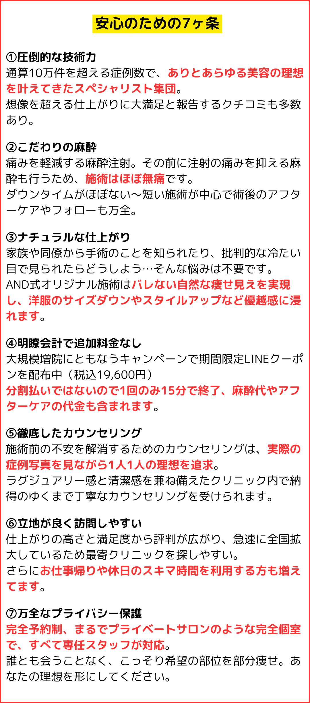 - AAND美容外科では強引は勧誘は一切行っておりません。お客様に安心してご利用いただくために、公式LINEより納得できるまで何度でもご質問いただけますので是非ご利用ください。今まで他人に相談できなかった悩みやコンプレックスを解消できたと大変好評です。